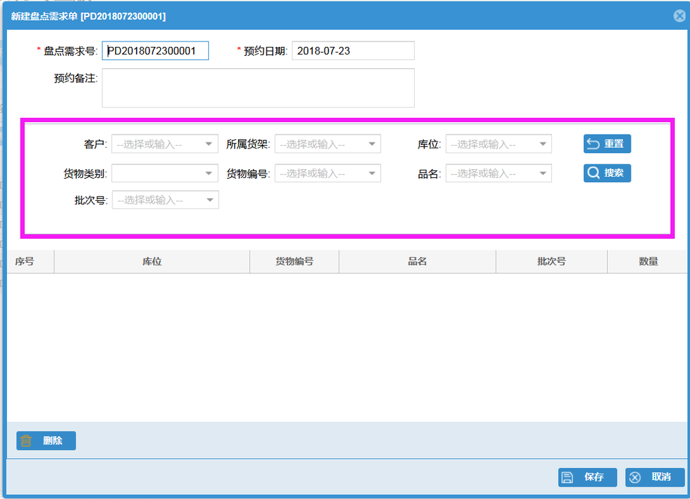 点击新建,通过对客户、货架、库位、货物类别等信息的搜索来查询出盘点对象;