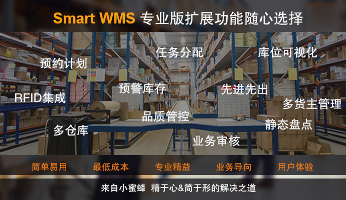 Smart WMS意味着改变传统的仓库管理方式,对业务实现更透彻的感应和度量,相互之间更全面的互联互通,在此基础上我们获得更智慧的洞察。Smart WMS不仅是管理系统,也是一种全新前沿的管理仓库的理念和方式。小蜜蜂Smart WMS团队致力于与客户、合作伙伴共同成长,预见未来。